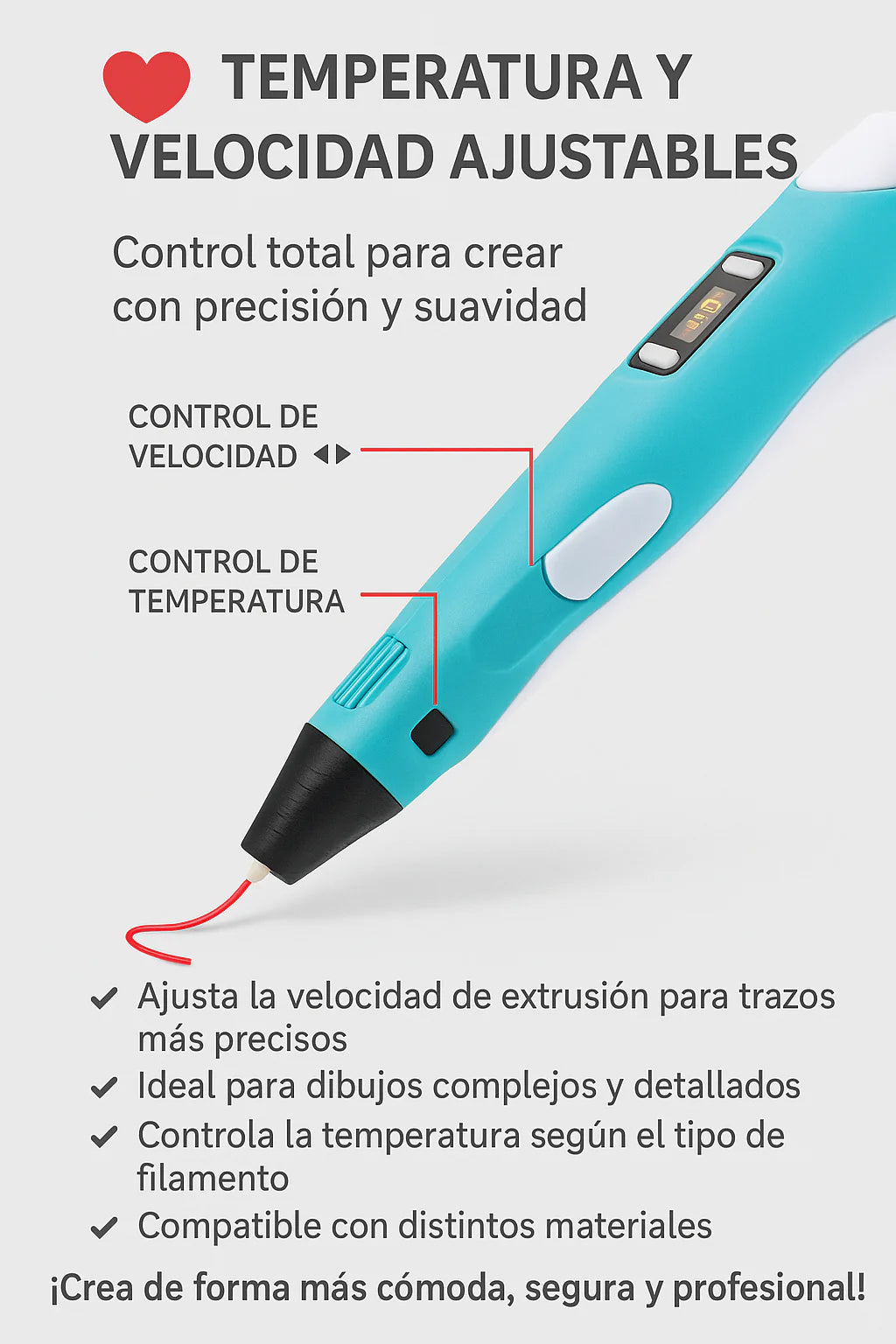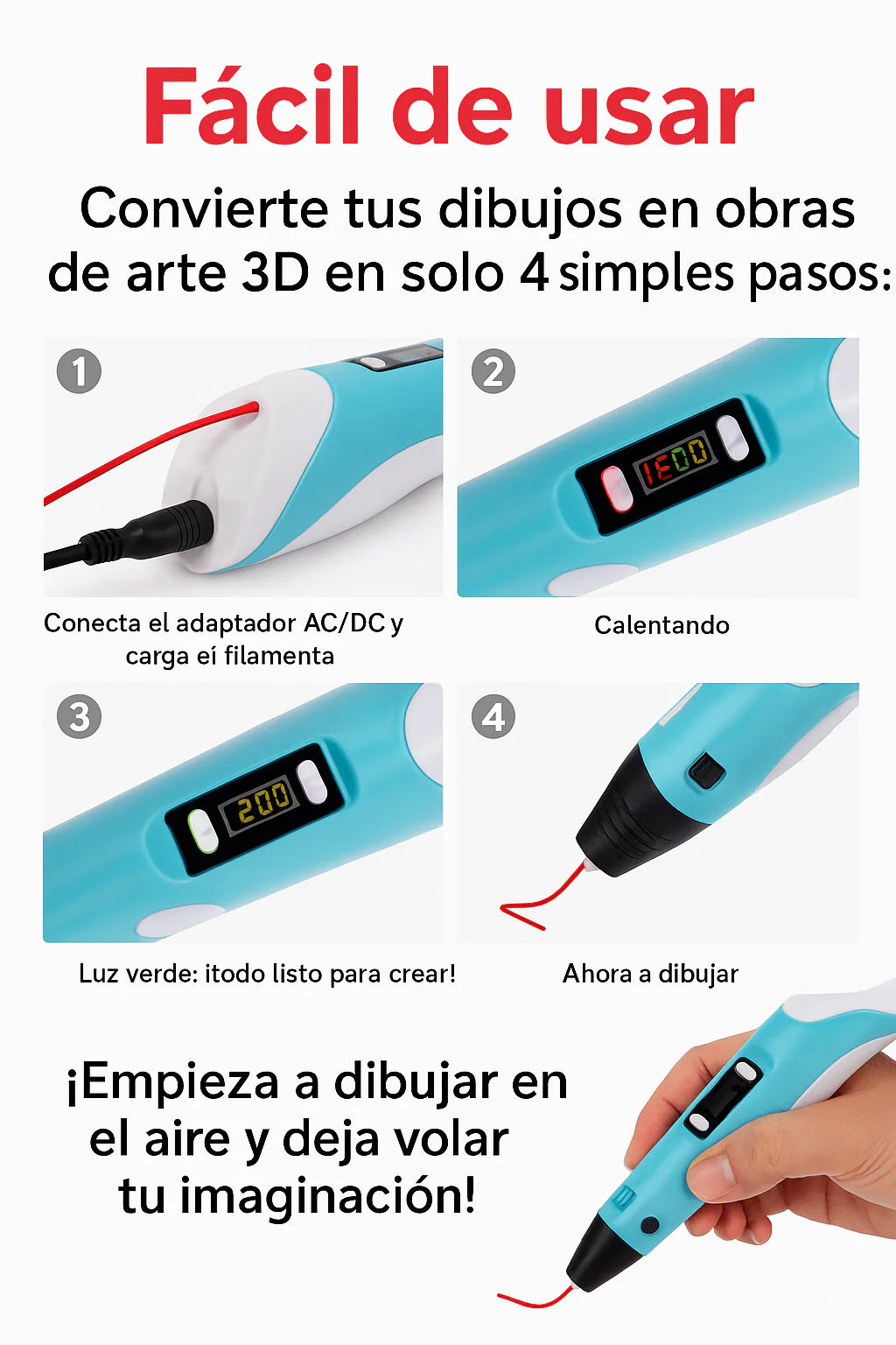 - Incluye: lápiz, base, 3 colores de filamento, cable USB y manual ilustrado.