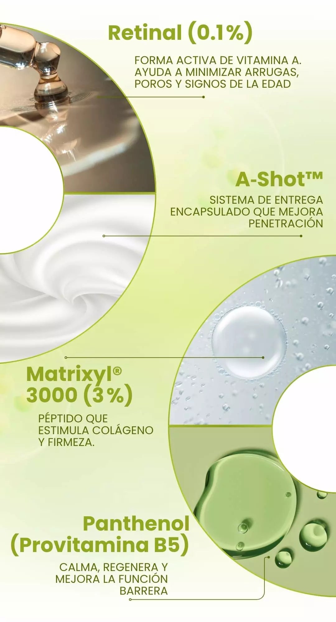 Con retinal al 0,1 % y tecnología A-Shot™, penetra profundo para afinar textura, reducir poros visibles y suavizar arrugas sin irritar